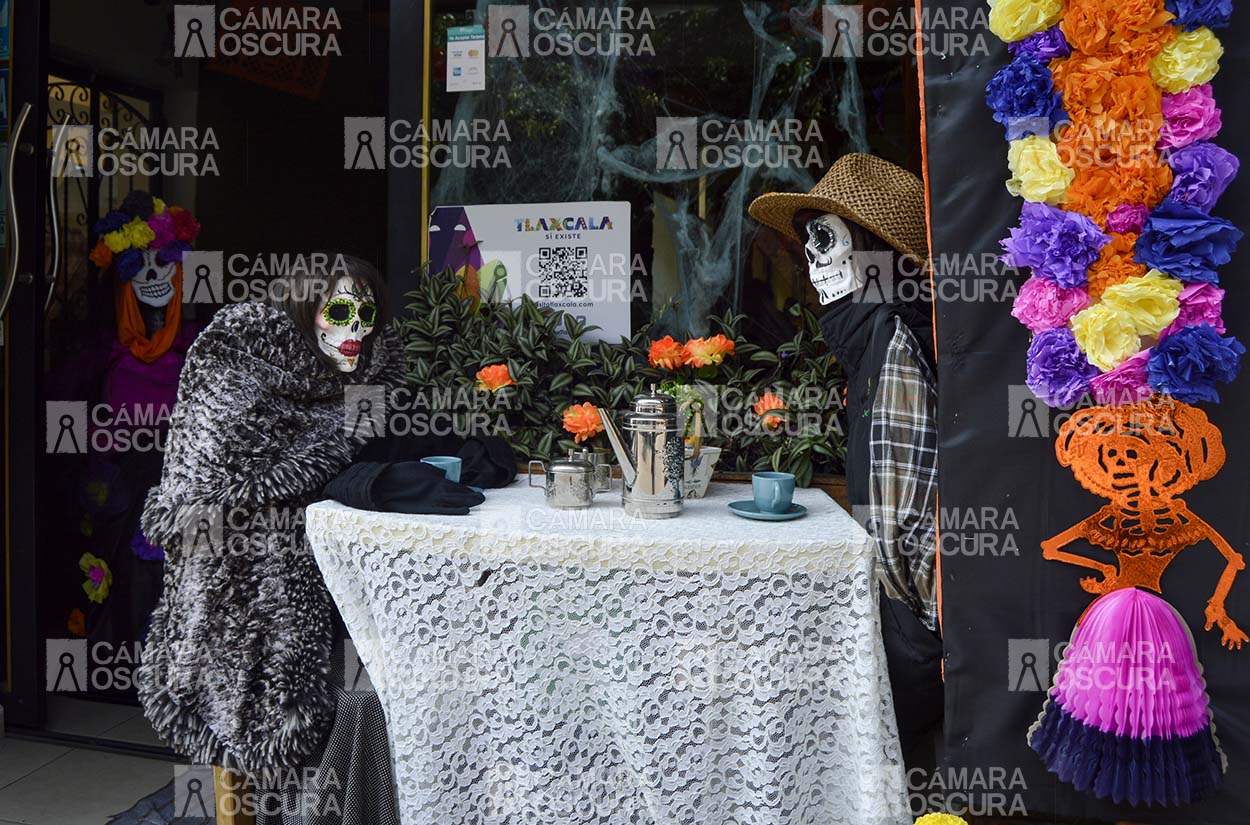 Comerciantes del primer cuadro de la capital de Tlaxcala, adornan fachadas para participar en el concurso”Adorna tu puerta y tu ventana” con motivo de las festividades de día de muertos.