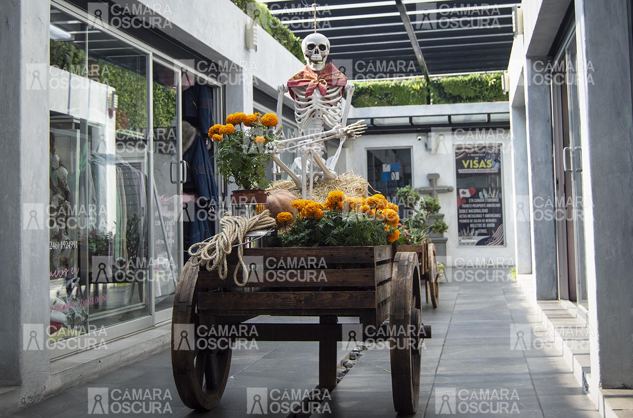 Comerciantes del primer cuadro de la capital de Tlaxcala, adornan fachadas para participar en el concurso”Adorna tu puerta y tu ventana” con motivo de las festividades de día de muertos.