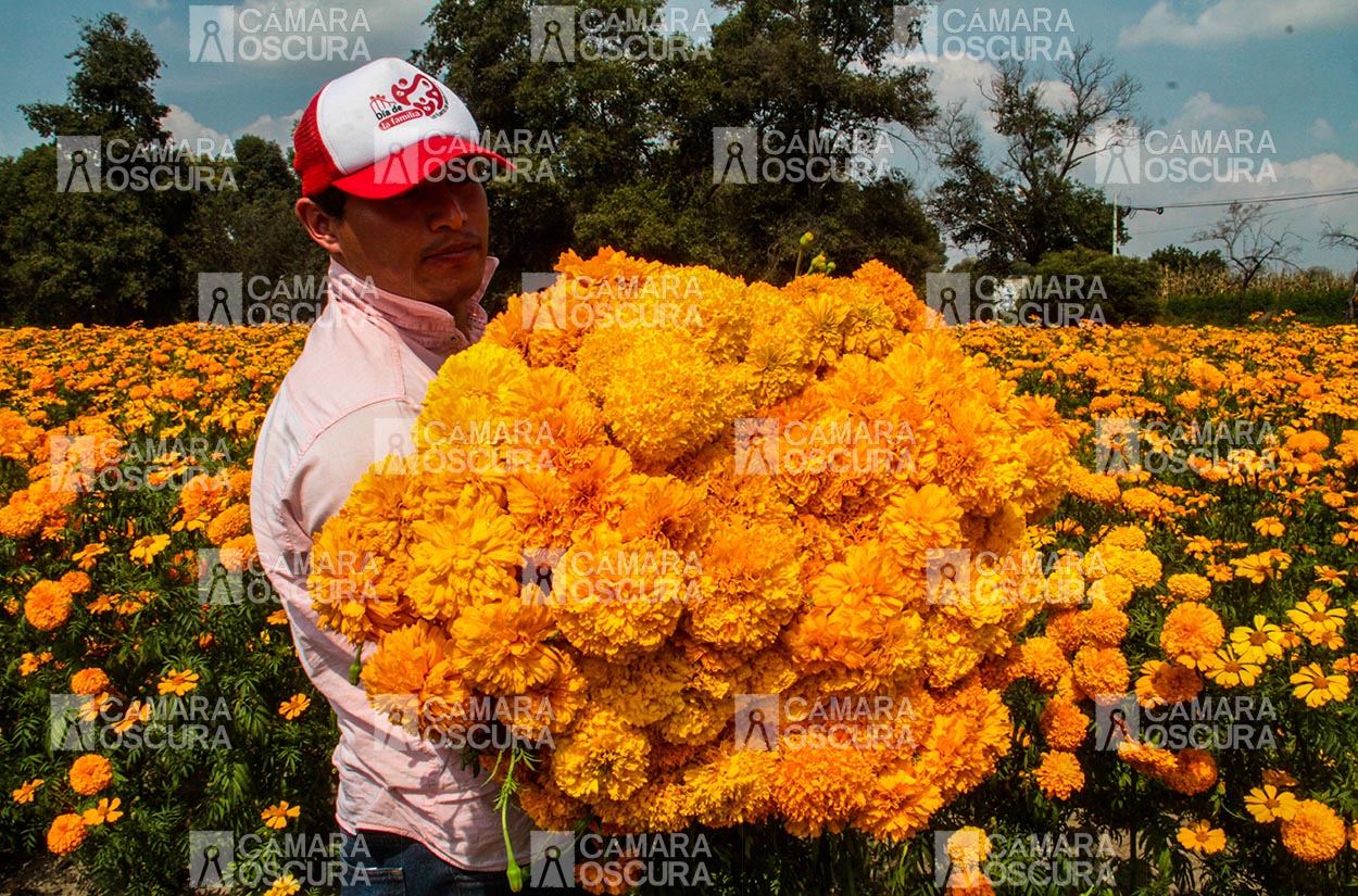Tlaxcala, Tlax- 27 de octubre del 2022. Productores agrícolas del municipio de Tepeyanco, realizan el corte para la comercialización de la flor de cempasúchil.